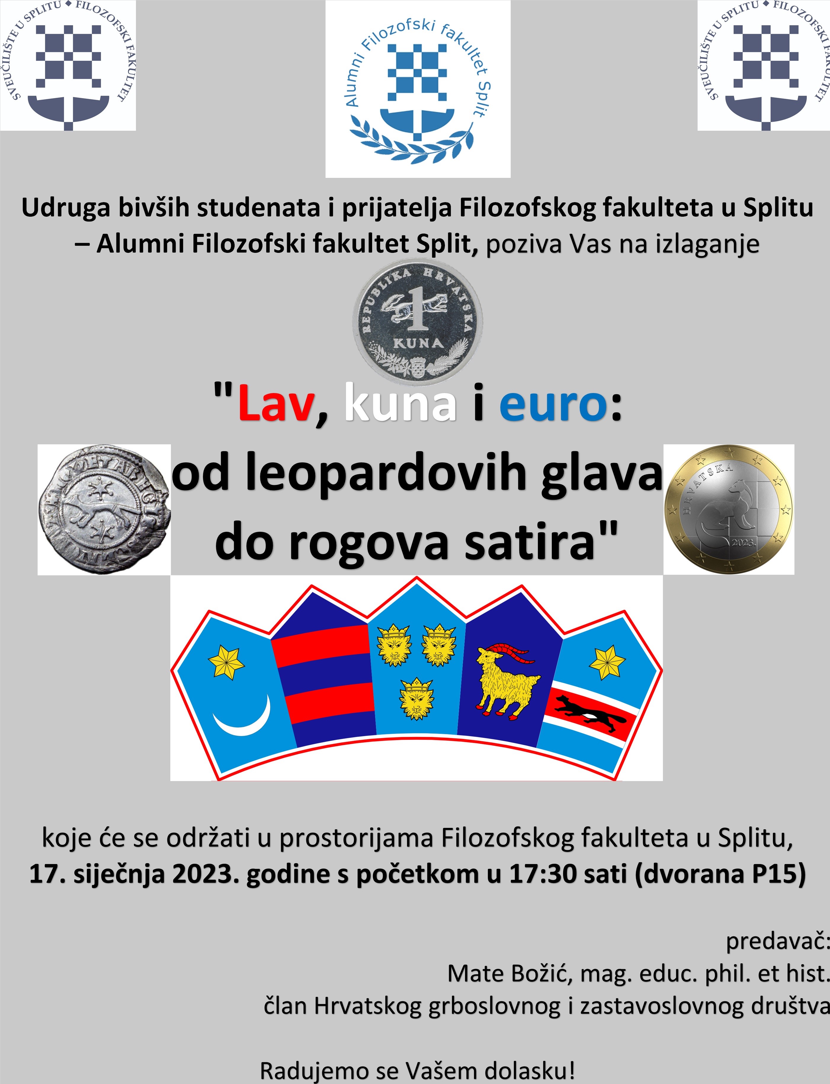 Udruga bivših studenata i prijatelja Filozofskog Fakulteta u Splitu - Alumni FFST organizira predavanje pod nazivom „Lav, kuna i euro: od leopardovih glava do rogova satira“, koje će održati alumni Mate Božić, mag. educ. hist. et phil, 17. siječnja 2023. godine s početkom u 17:30 sati u dvorani P15. Ovo je predavanje nastavak na prethodno izlaganje naslovljeno „Šahirana polja Hrvatske od Krbavske bitke/1494. do Markova trga/1990.“, koje je Mate Božić održao 15. lipnja 2022., također u organizaciji Udruge bivših studenata i prijatelja Filozofskog Fakulteta u Splitu - Alumni FFST, a u okviru kojega je tematiziran nastanak i mijene službenog hrvatskog grba sa šahiranim poljima kroz povijest.