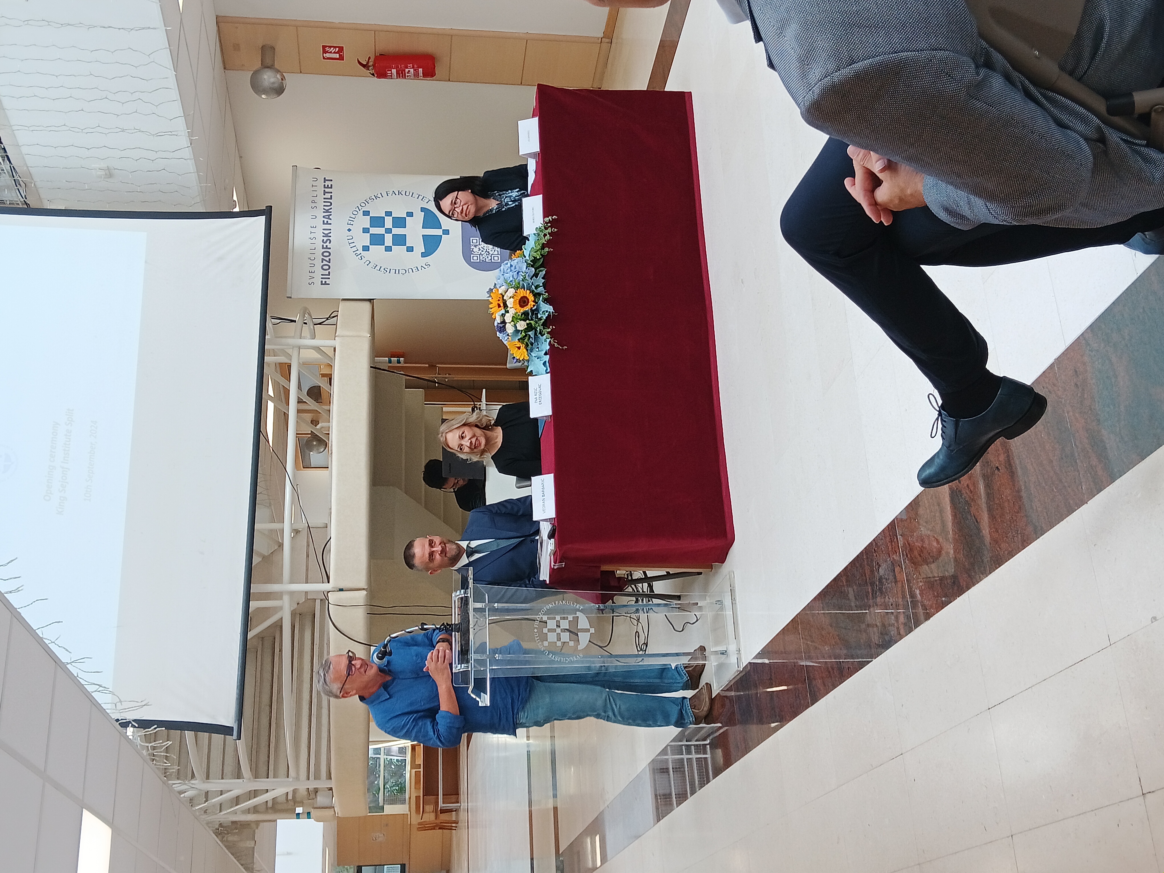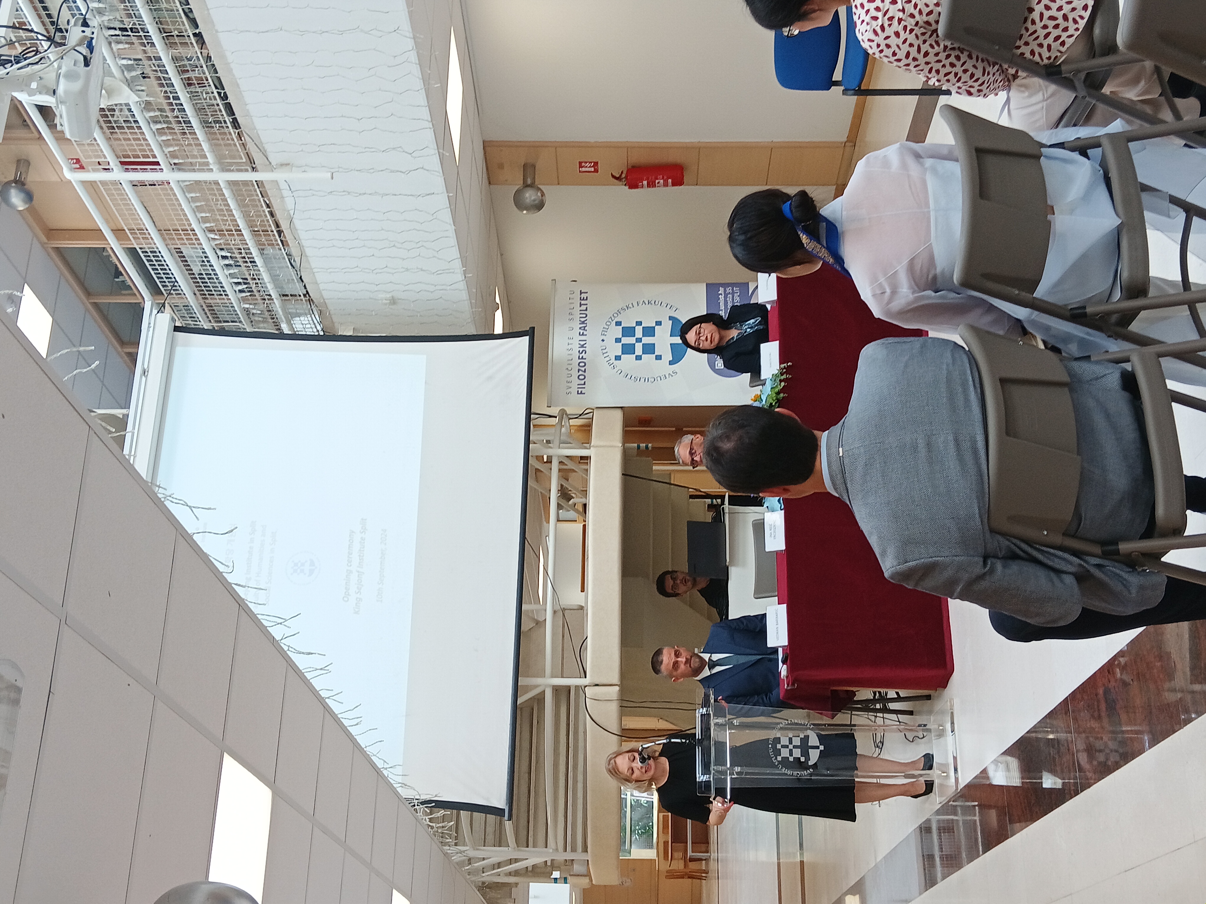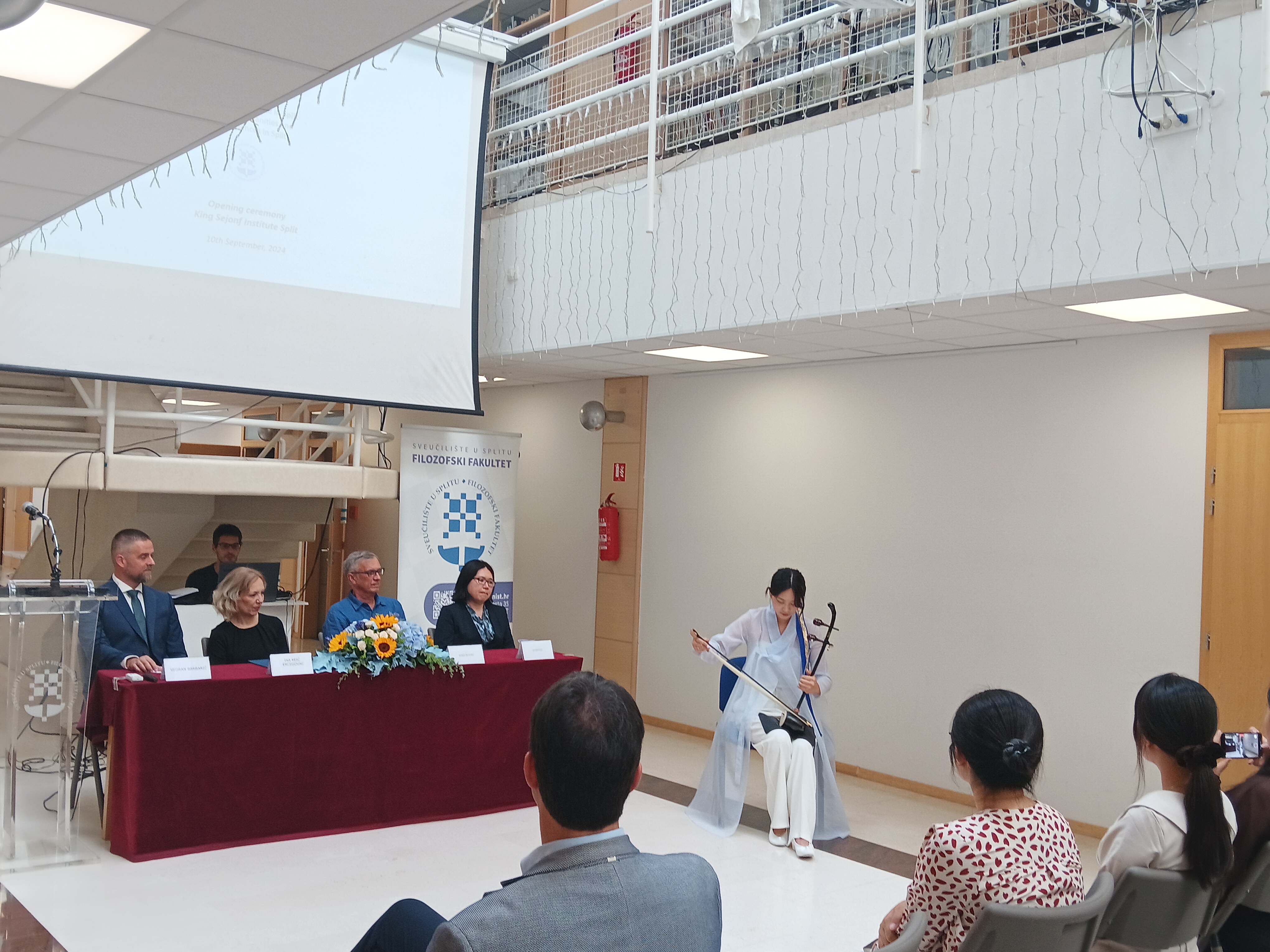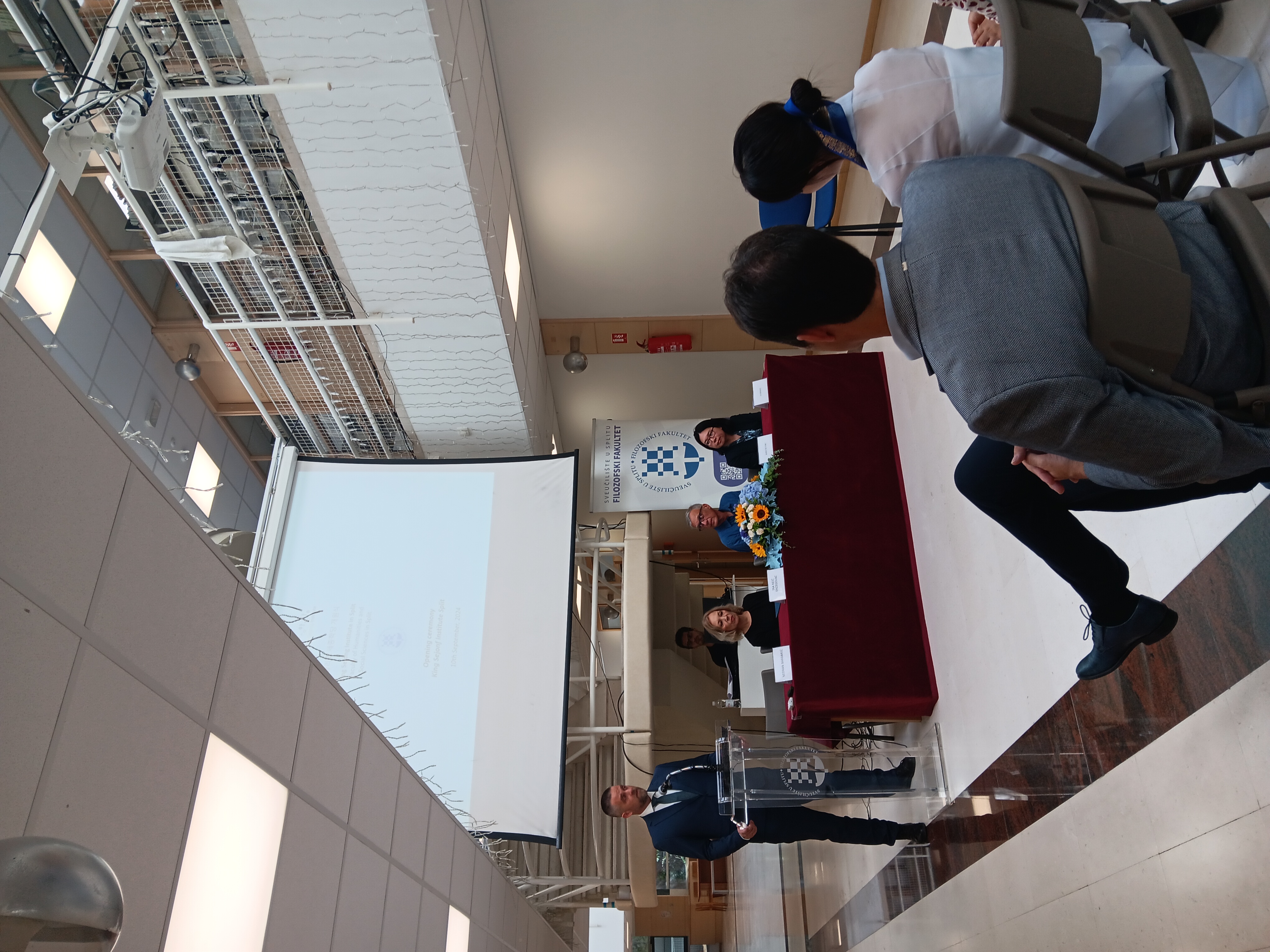 U utorak, 10. rujna 2024. godine, na Filozofskom fakultetu u Splitu održana je svečanost otvaranja King Sejong Institute. Uz prisutnost dekanice Fakulteta, prof. dr. sc. Ine Reić Ercegovac, prodekana izv. prof. dr. sc. Vedrana Barbarića te prof. dr. sc. Borisa Škorca, događaj su uveličali i drugi gosti. Među uzvanicima su bile predstavnice Korejske ambasade u Republici Hrvatskoj, gđa. Jo Ihnhee i gđa. Eunbin Kim, predstavnice King Sejong Institute iz Zagreba, gđa. Lina Seonghyun Kwon i gđa. Hyoji Lee, predstavnica iz Ljubljane gđa. Hyeonsook Ryu te predstavnica iz Rijeke gđa. Jimin Shin, koja je obogatila svečanost izvedbom na tradicionalnom korejskom instrumentu 'Haegeum'. Također, okupljenima se putem video poruke obratila predsjednica centralnog King Sejong Institute, gđa. Hejong Lee. Svečanost su podržali i predstavnici Sveučilišta u Splitu, prorektor prof. dr. sc. Zoran Đogaš, predstavnica Hrvatske gospodarske komore gđa. Suzana Prkić Jurić te polaznici tečajeva.