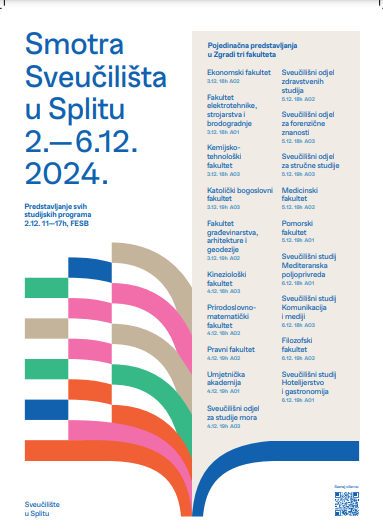 U tjednu od 2. - 6. prosinca 2024. godine održava se Smotra Sveučilišta u Splitu. Predstavljanje svih studijskih programa će se održati 2. prosinca 2024. godine od 11.00 do 17.00 sati u zgradi FESB-a. Predstavljanje Filozofskog fakulteta u Splitu će biti 6. prosinca 2024. godine u 19.00 sati u amfiteatru A02.