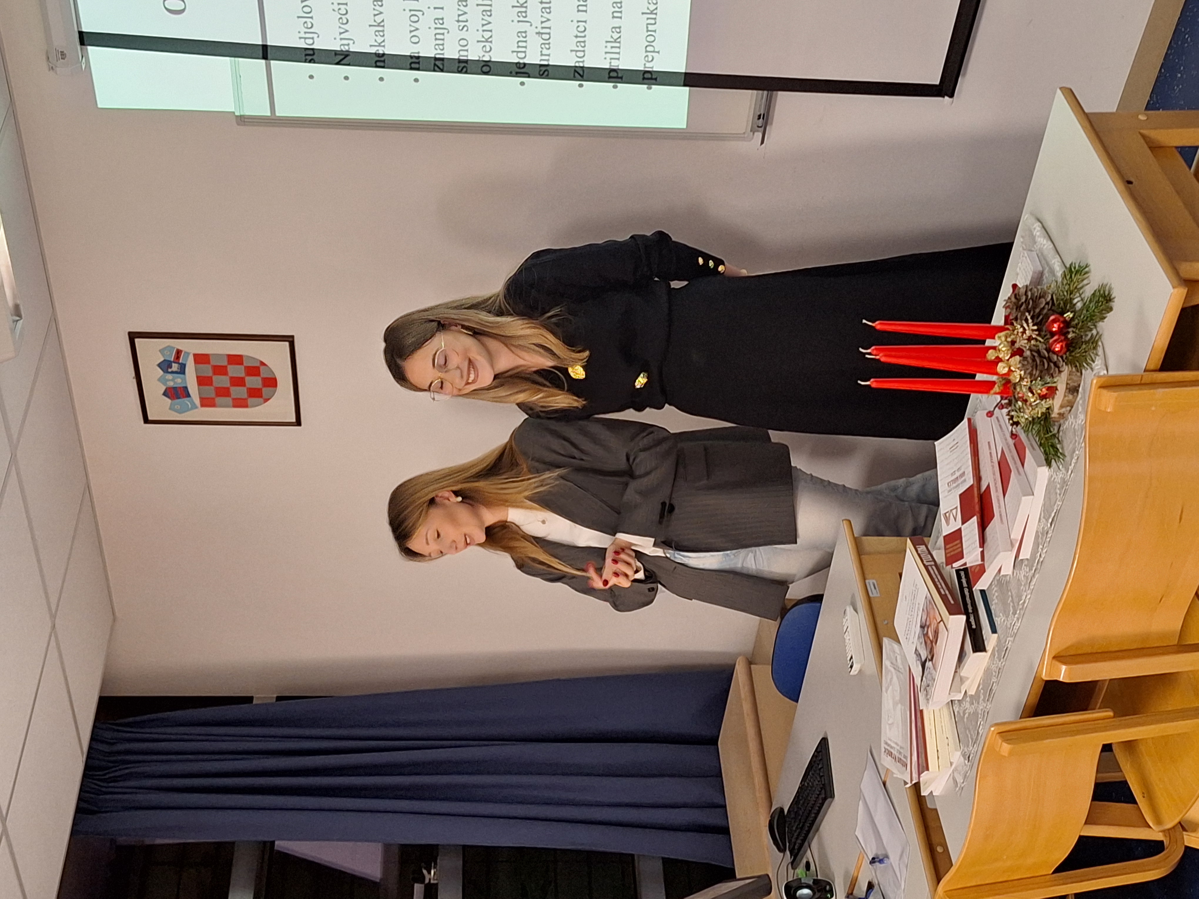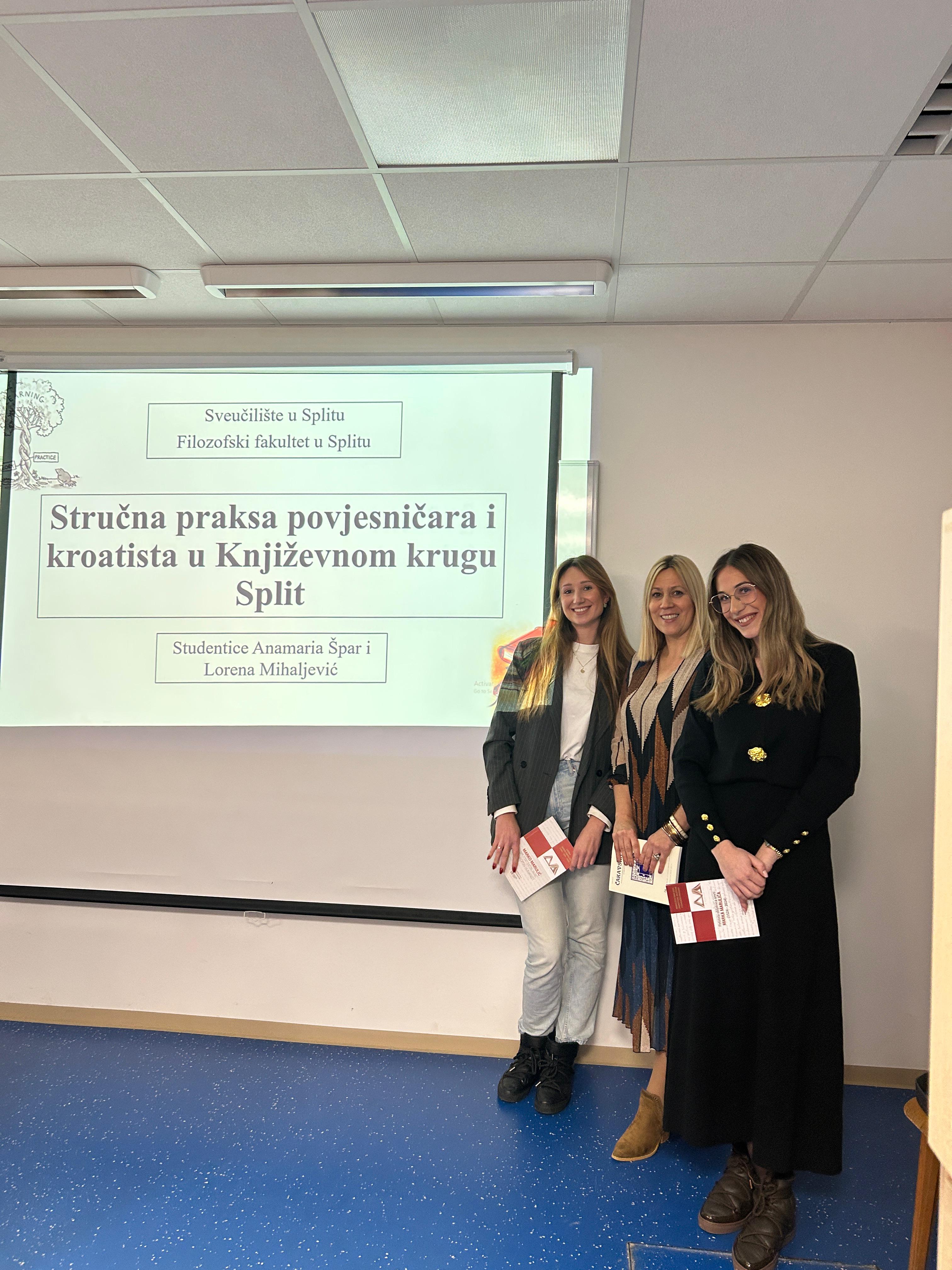 U organizaciji Odsjeka hrvatski jezik i književnost i Odsjeka za povijest u srijedu 11. prosinca 2024. u sklopu adventskih događanja održano je predavanje ISKUSTVA STUDENATA U NASTAVNOJ BAZI KNJIŽEVNI KRUG U SPLITU u kojem su studentice, apsolventice Anamarija Špar i Lorena Mihaljević s Odsjeka za povijest i Odsjeka za hrvatski jezik i književnost iznijele svoju lijepu priču i još ljepše dojmove o odrađenoj stručnoj praksi u jednoj od nastavnih baza Filozofskog fakulteta u Splitu KNJIŽEVNOM KRUGU - SPLIT