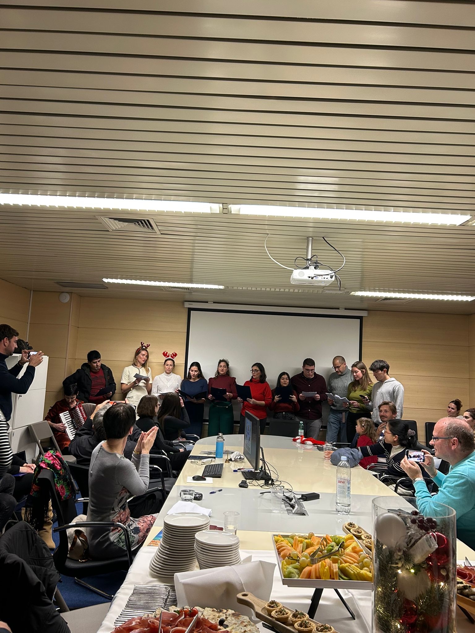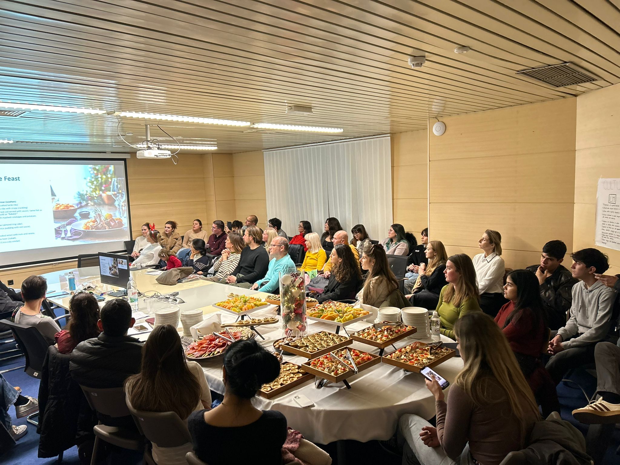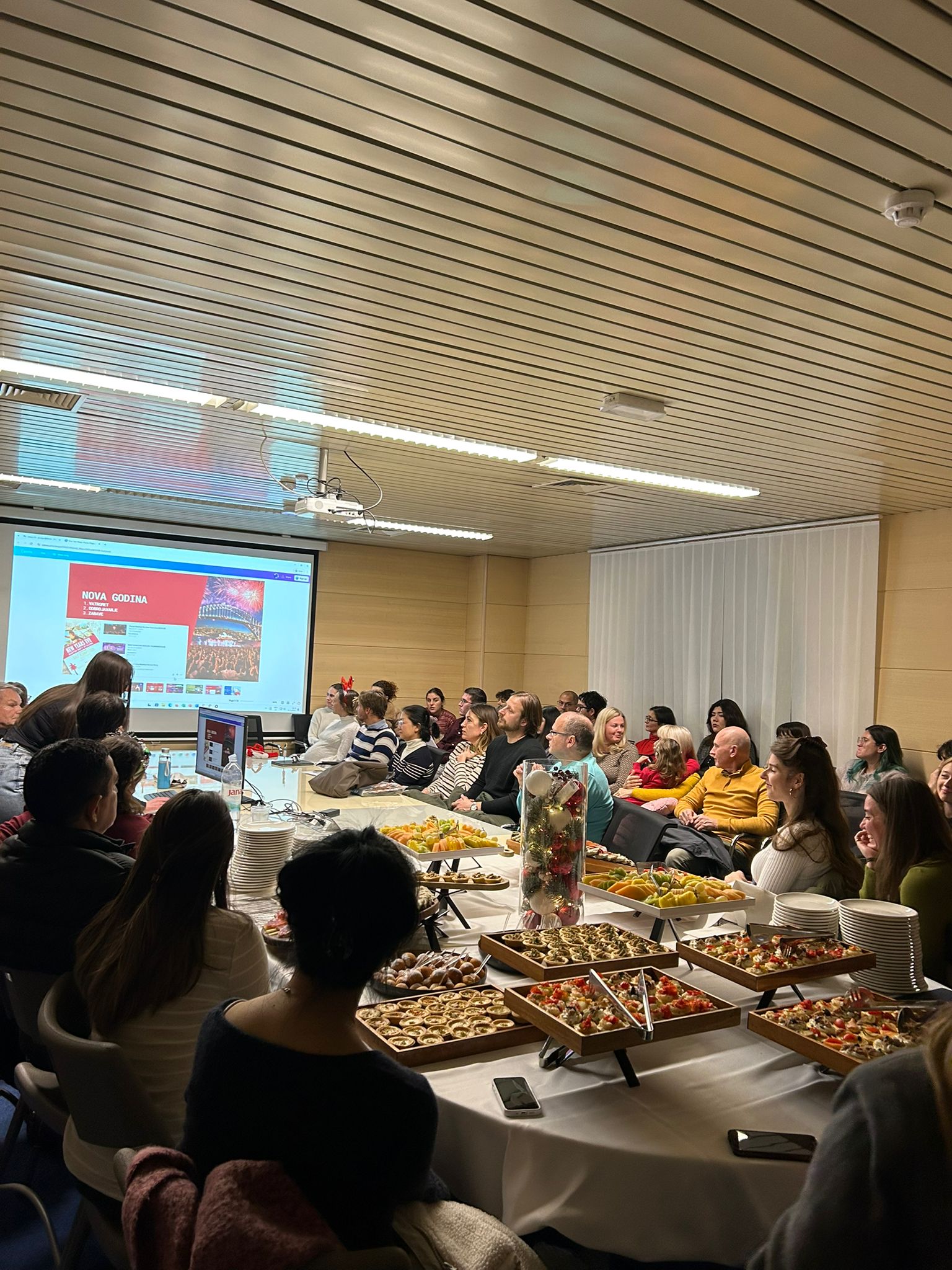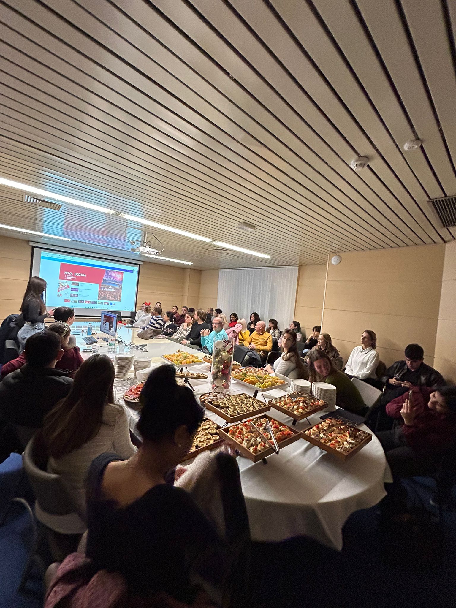 Okrugli stol Božić diljem svijeta bio je prilika da naši polaznici pokažu kako su usvojili hrvatski jezik, ali i da nam predstave svoje običaje za Božić i Novu godinu. Obišli smo u jednu večer cijeli svijet: krenuli smo iz Australije, gdje se Nova godina dočekuje na plaži, preko Sjeverne i Južne Amerike stigli smo u sjevernu Europu, u Norvešku, odakle nam dolazi bakalar koji se kod nas jede na Badnjak, pa smo preko Njemačke stigli u istočnu Europu, u Slovačku, zatim u Rusiju i naposljetku smo proslavili lunarnu Novu godinu u Južnoj Koreji. Okrugli je stol bio popraćen glazbenim izvedbama: Mariciello Garvan izvela je tradicionalnu peruansku pjesmu Huayno de Navidad, a Federico Zampini pjesmu Mi burrito sabanero uz glazbenu pratnju Franca Luigija i Ines na saksofonu. Glazbenu točku iznenađenja imala je i Ruskinja Elena Kazhe. Posebnu su pohvalu zaslužili polaznici B1 razine hrvatskoga jezika, koji nisu glazbeno obrazovani, ali su uz pratnju svoje lektorice dr. sc. Helene Burić na harmonici izveli dvije pjesme na hrvatskom jeziku: Ta divna splitska noć i U to vrime godišta, pritom oduševivši sve prisutne. Okrugli je stol zaključen druženjem uz tradicionalnu hrvatsku hranu i piće. Topla i prijateljska atmosfera zbližila je i ujedinila ljude iz cijeloga svijeta u jednoj divnoj, splitskoj noći.