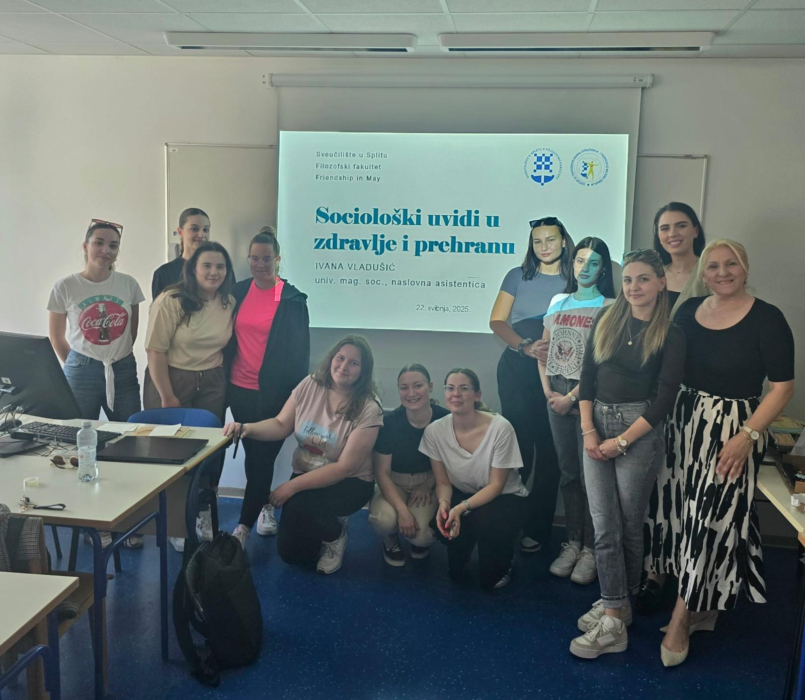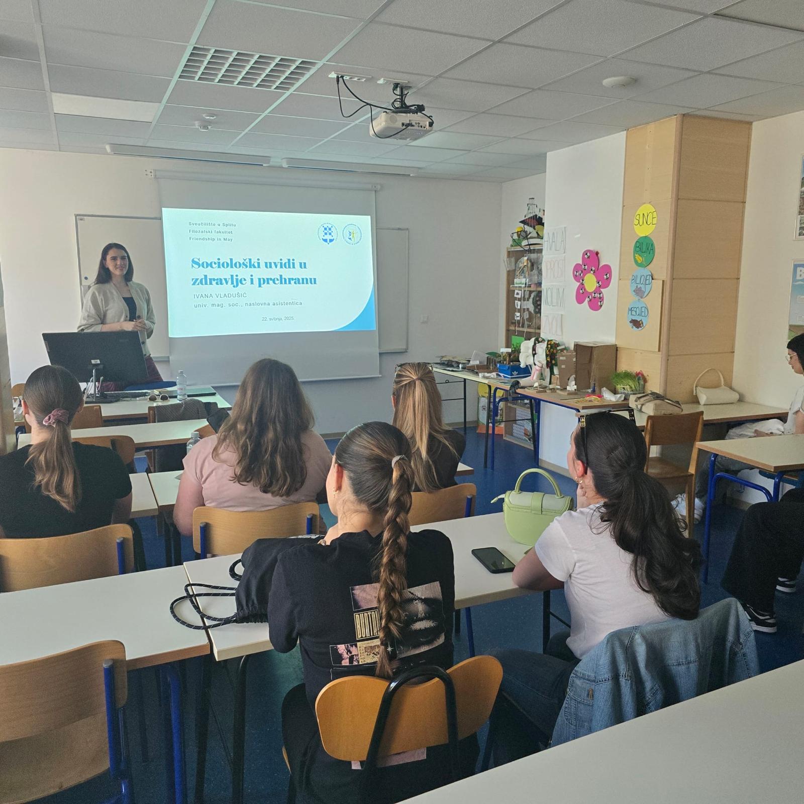 Na Filozofskom fakultetu Sveučilišta u Splitu, 22. svibnja 2025., održano je predavanje i radionica Sociološki uvidi u zdravlje i prehranu, koje je izložila Ivana Vladušić, univ. mag. soc., naslovna asistentica. Događaj je privukao brojne studente i nastavnike zainteresirane za dublje razumijevanje naizgled svakodnevnih tema – hrane i zdravlja – iz perspektive društvenih znanosti.