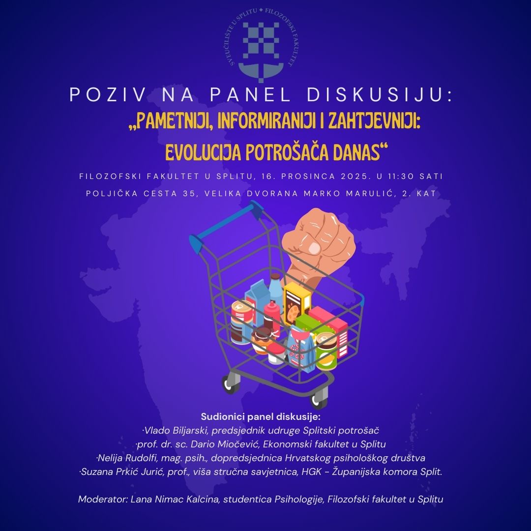 Pozivamo sve zainteresirane na panel diskusiju „Pametniji, informiraniji i zahtjevniji: Evolucija potrošača danas" koja će se održati 16. prosinca 2025. godine u 11:30 sati na Filozofskom fakultetu u Splitu (Poljička cesta 35, dvorana Marko Marulić, 2. kat).