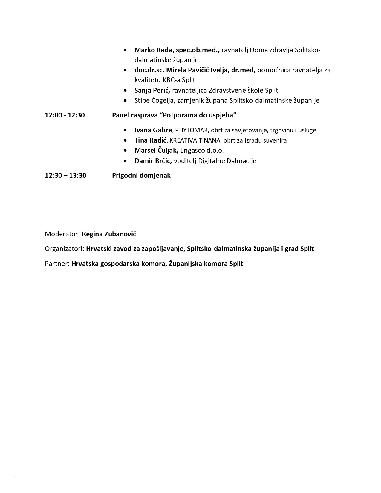 Na konferenciji će biti predstavljene potpore HZZ-a, Grada Splita i Splitsko-dalmatinske županije namijenjene poduzetnicima, raspravljat će se o deficitarnosti kadrova u zdravstvu te će biti prikazani primjeri dobre prakse korištenja potpora Hrvatskog zavoda za zapošljavanje.