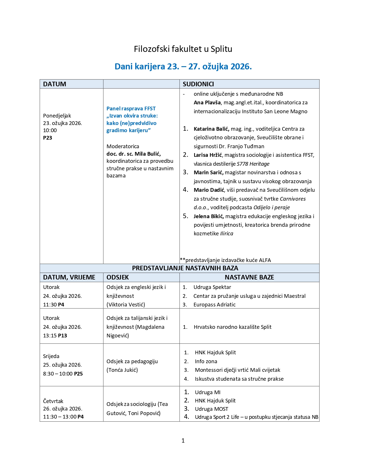 Program započinje panel-raspravom „Izvan okvira struke: kako (ne)predvidivo gradimo karijeru“, na kojoj će sudjelovati stručnjaci iz područja obrazovanja, poduzetništva, medija i kreativnih industrija, u ponedjeljak 23. ožujka u 10h u učionici P5. Panel će otvoriti prostor za razgovor o različitim karijernim putevima te o tome kako studij humanističkih i društvenih znanosti može voditi prema raznovrsnim profesionalnim prilikama.