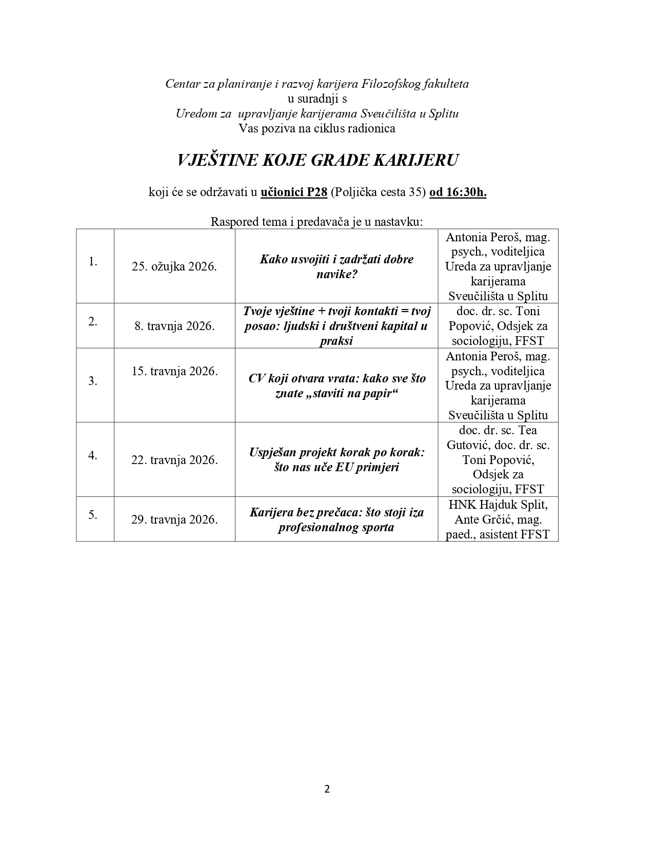 Uz to, u suradnji s Uredom za karijere Sveučilišta u Splitu organiziran je i ciklus radionica „Vještine koje grade karijeru“, koji će se održavati u učionici P28 (Poljička cesta 35) od 16:30 sati. Radionice su usmjerene na razvoj ključnih kompetencija potrebnih za ulazak na tržište rada, a teme uključuju razvoj dobrih navika, izgradnju profesionalne mreže kontakata, izradu učinkovitog životopisa, upravljanje projektima te razumijevanje profesionalnog razvoja u sportskom sektoru.