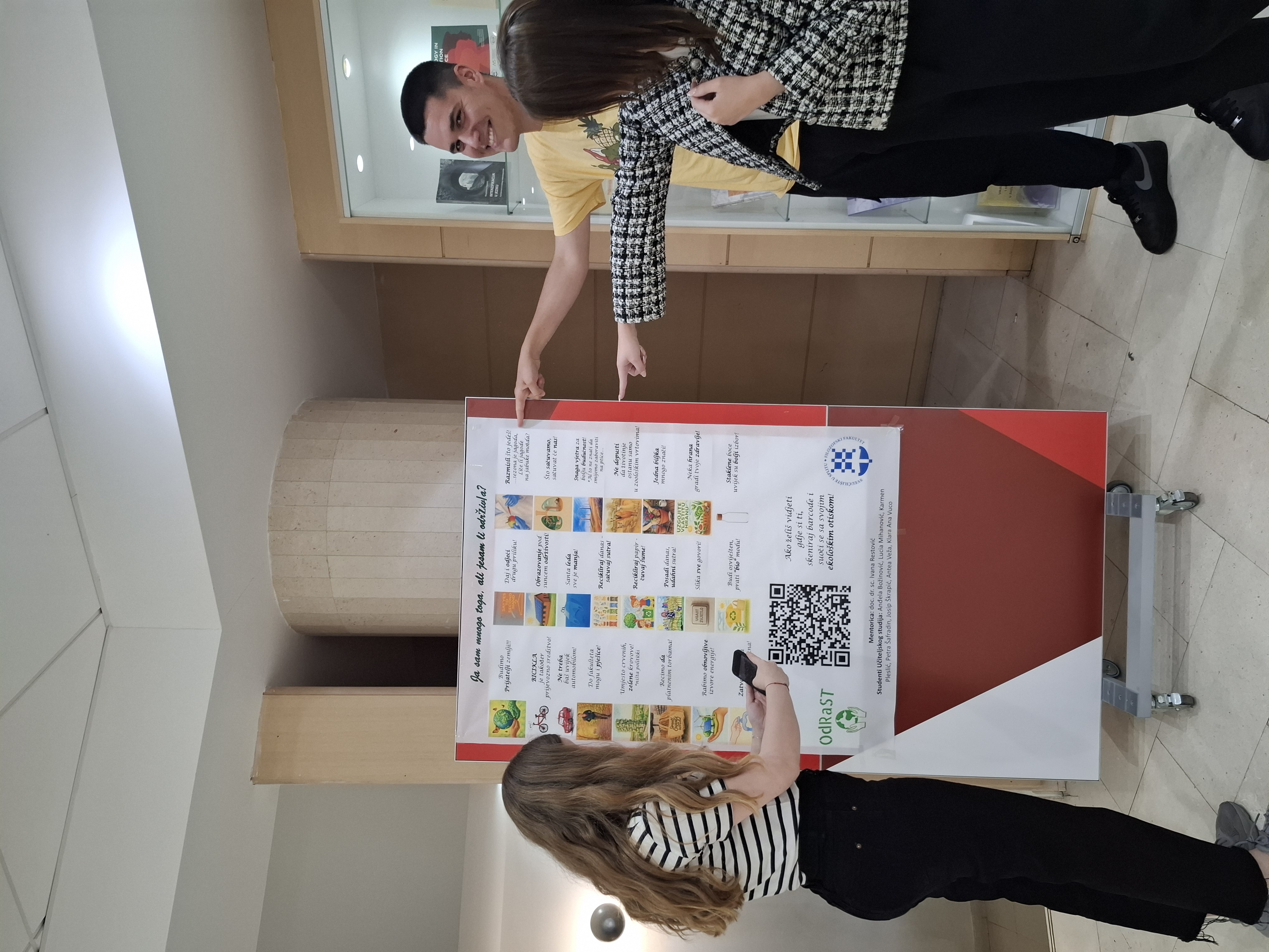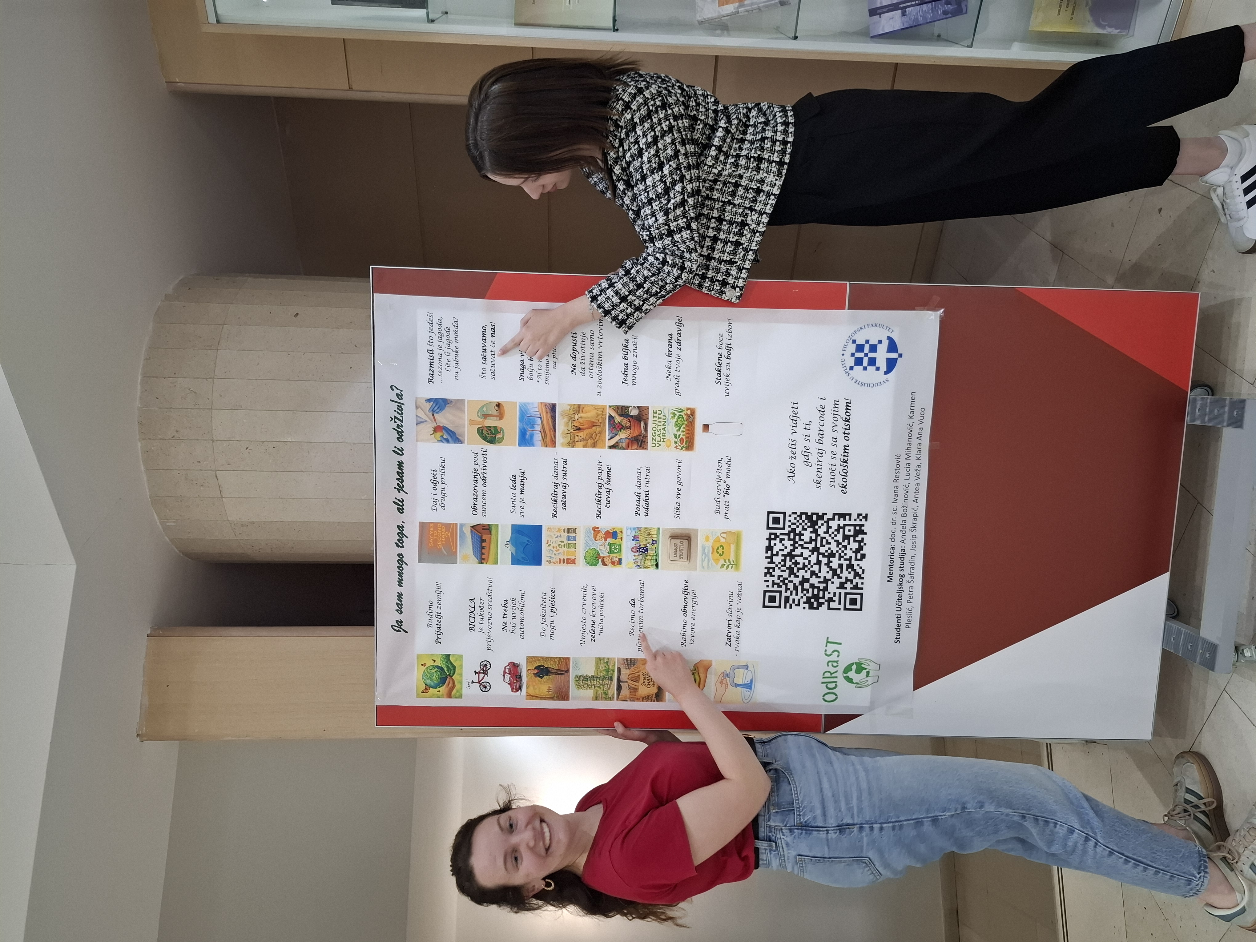 As part of the Friendship in May event, which is held every May at the Faculty of Philosophy, University of Split, the OdRaSt Center and 3rd year students of the Teacher Education Department Anđela Božinović, Lucia Mihanović, Karmen Pleslić, Petra Šafradin, Josip Škrapić, Antea Veža and Klara Ana Vuco, under the mentorship of Prof. Ivana Restović, PhD, created an educational poster on "I am many things, but am I sustainable?" to encourage individuals to think about their lifestyle and its impact on nature.