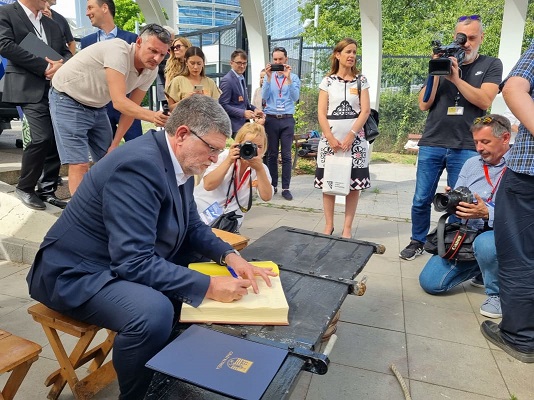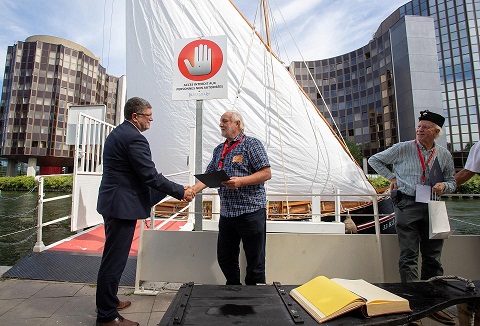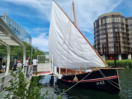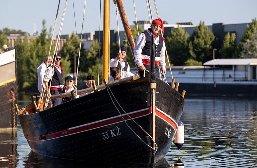 On July 5, 2022, the falkuša "Comeza-Lisboa" sailed through the channels of the Rhine to the palace of the EU Parliament, where a welcome was arranged with an appropriate program and the awarding of the position "Honorary Captain" of falkuša "Comeza-Lisboa" to the President of the EU Parliament Roberta Metsola, a Croatian EU parliamentarian Tonino Picula, and the secretary of the European Maritime Heritage Congress Thedo Fruithof. The flag of the Faculty of Humanities and Social Sciences in Split was at the falkuša gala, next to the Croatian flag, the EU flag and the flag of the City of Komiža. In the EU parliament, the klapa group "Filip Dević" from Split performed Joško Božanić's song "Jur ni jelna na svit borka" from the sonnet sequence "Praise to Falkuša" (Pohvala Falkuši), along with the Croatian national anthem and "Ode to Joy".