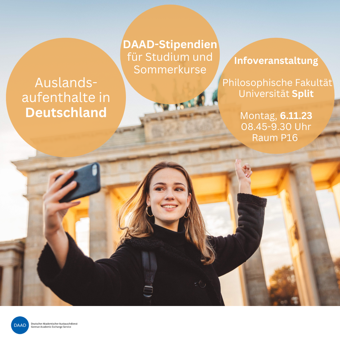 6. studenoga 2023. godine od 8.45 do 9.30 sati u P16 DAAD-lektorica iz Zadra Judith Hansmeier drži informativno predavanje o aktualnim stipendijama u Njemačkoj.