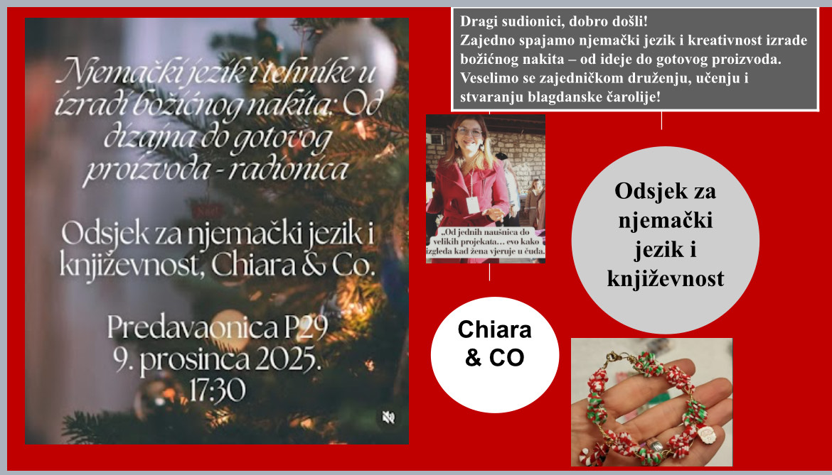 Na adventskom programu Filozofskog fakulteta u Splitu, 9. prosinca 2025., održana je radionica „Njemački jezik i tehnike u izradi božićnog nakita: od dizajna do gotovog proizvoda“, pod vodstvom doc. dr. sc. Mirele Müller, u suradnji s Chiara & Co i studentima Odsjeka za njemački jezik i književnost.