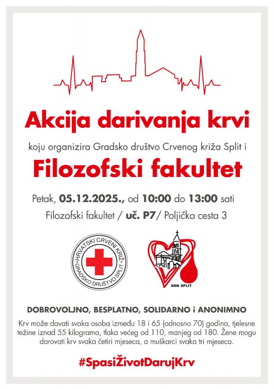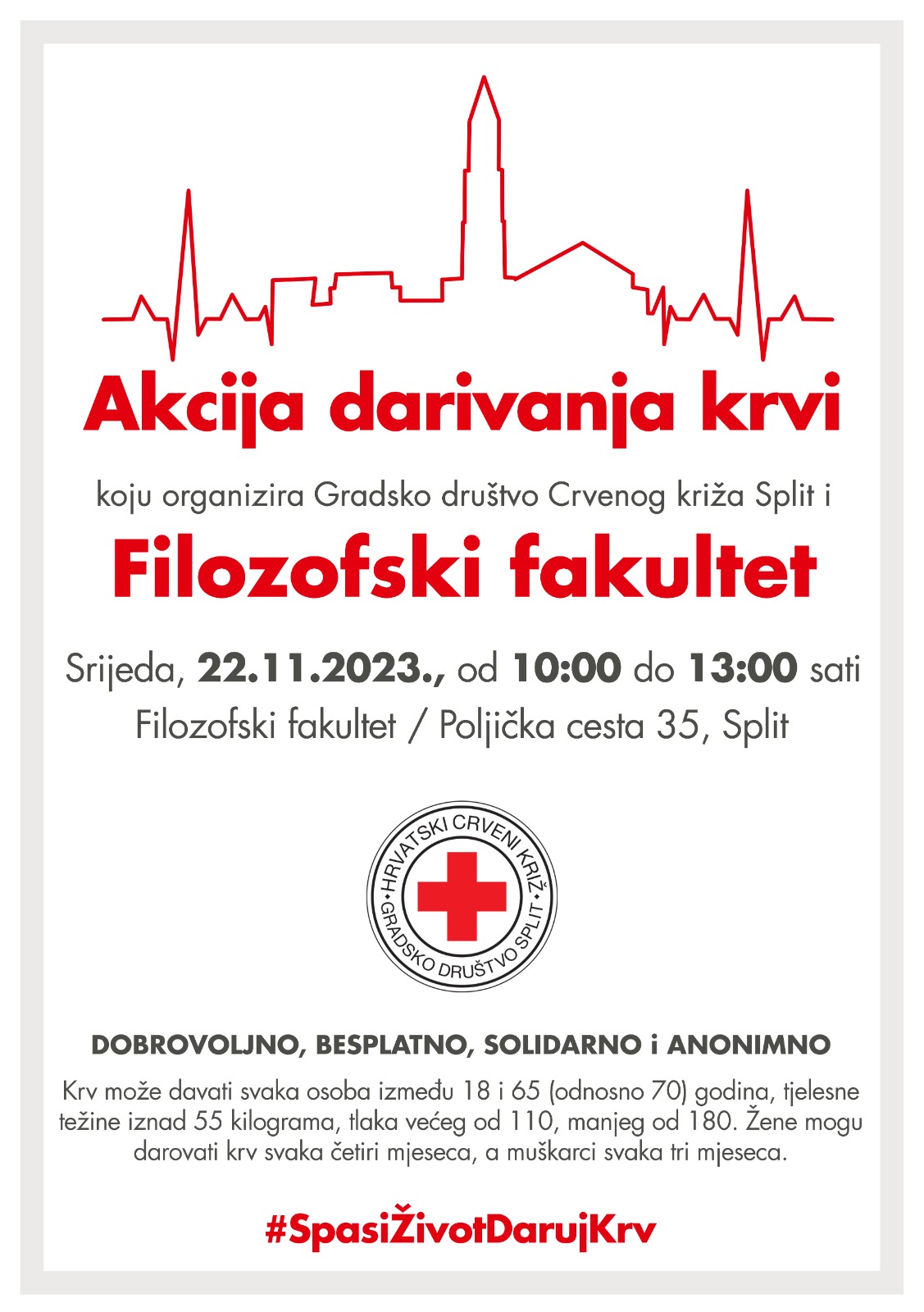 U organizaciji Gradskog društva Crvenog križa Split, Filozofskog fakulteta u Splitu i Udruge bivših studenata i prijatelja Filozofskog fakulteta u Splitu održana je akcija dobrovoljnog darivanja krvi.