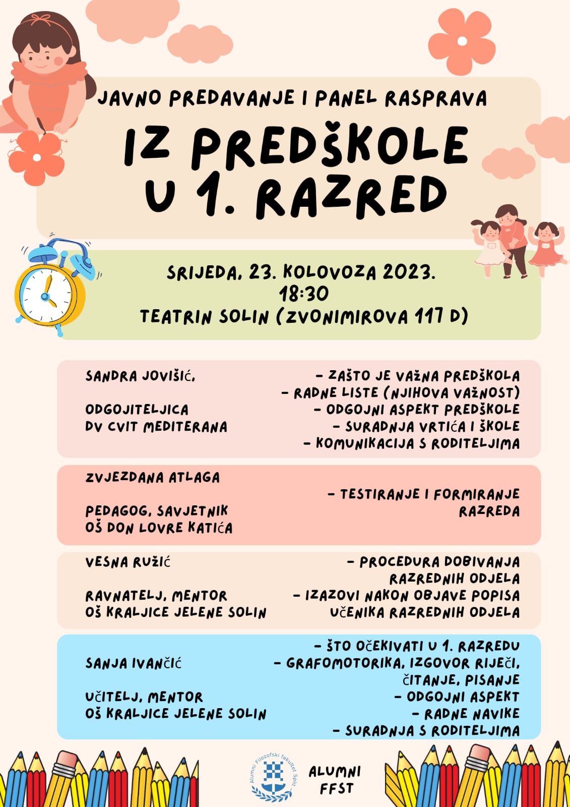 U srijedu 23. kolovoza 2023. održano je javno predavanje i panel diskusija o iskustvima prelaska djece iz vrtića u školu pod naslovom Iz predškole u 1. razred. Dobro popunjenom auditoriju o svojim iskustvima progovorile su Sandra Jovišić, Zvjezdana Atlaga, Vesna Ružić i Sanja Ivančić koje imaju bogato iskustvo u radu s djecom predškolske i školske dobi. Događaj je održan u Teatrinu Gradske knjižnice Solin, a u ime organizatora Udruge bivših studenata i prijatelja Filozofskog fakulteta u Splitu - Alumni FFST događaj je moderirala i svojim predavanjem obogatila potpredsjednica Udruge Sanja Ivančić.
