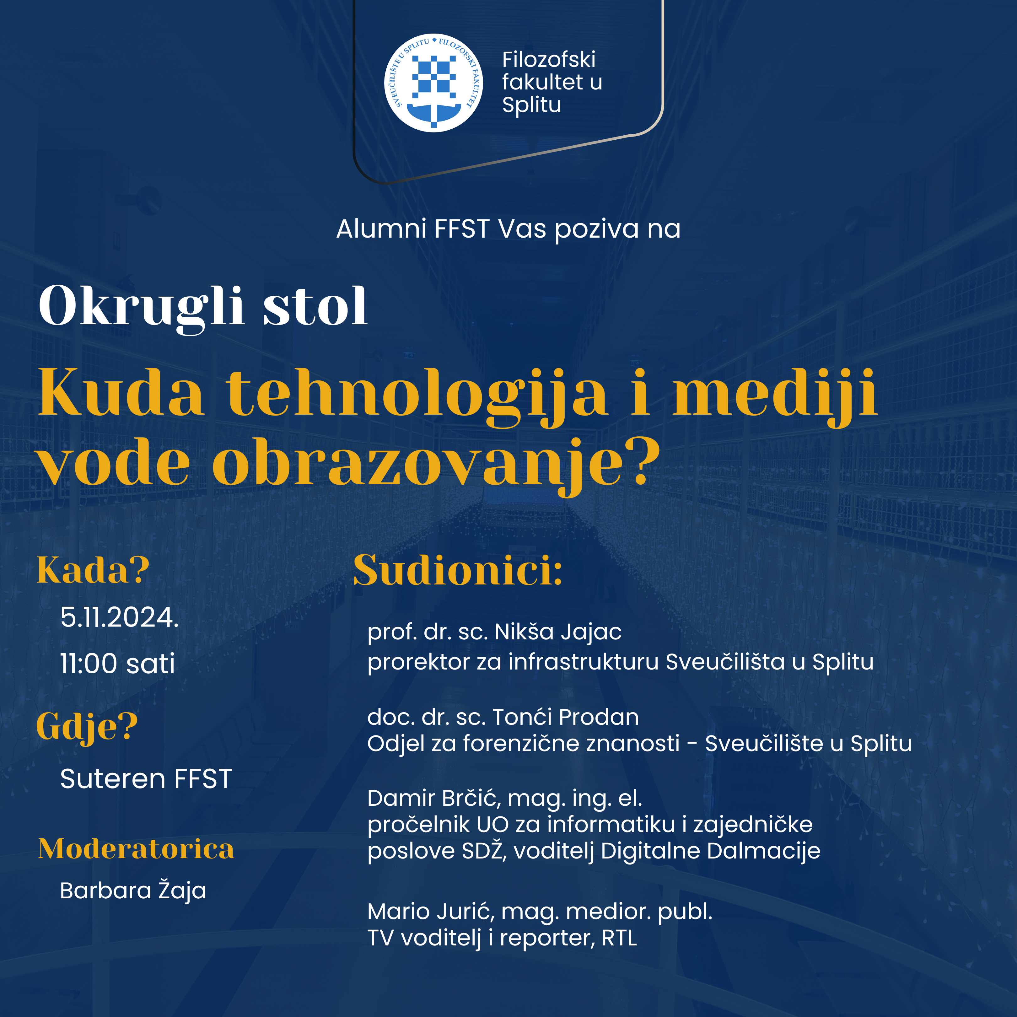 U utorak 5. 11. 2024. u 11 sati na Filozofskom fakultetu u Splitu bit će održan okrugli stol s temom „Digitalna transformacija: Kuda tehnologija i mediji vode obrazovanje?“ u organizaciji udruge Alumni FFST. O toj vrlo aktualnoj i složenoj temi govorit će prof. dr. sc. Nikša Jajac - prorektor za infrastrukturu Sveučilišta u Splitu, doc. dr. sc. Tonći Prodan - stručnjak za sigurnost, Damir Brčić - voditelj Županijskog tehnološkog huba „Digitalna Dalmacija“ i Mario Jurić – televizijski voditelj i reporter s RTL televizije. Događaj će moderirati članica Udruge Barbara Žaja.