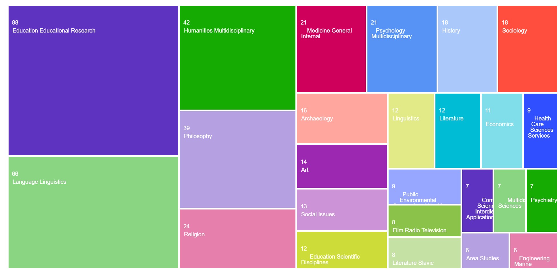 Pregled na istraživačka područja znanstvenika s Filozofskog fakulteta u WoS bazi podataka možete vidjeti na sljedećem prikazu: