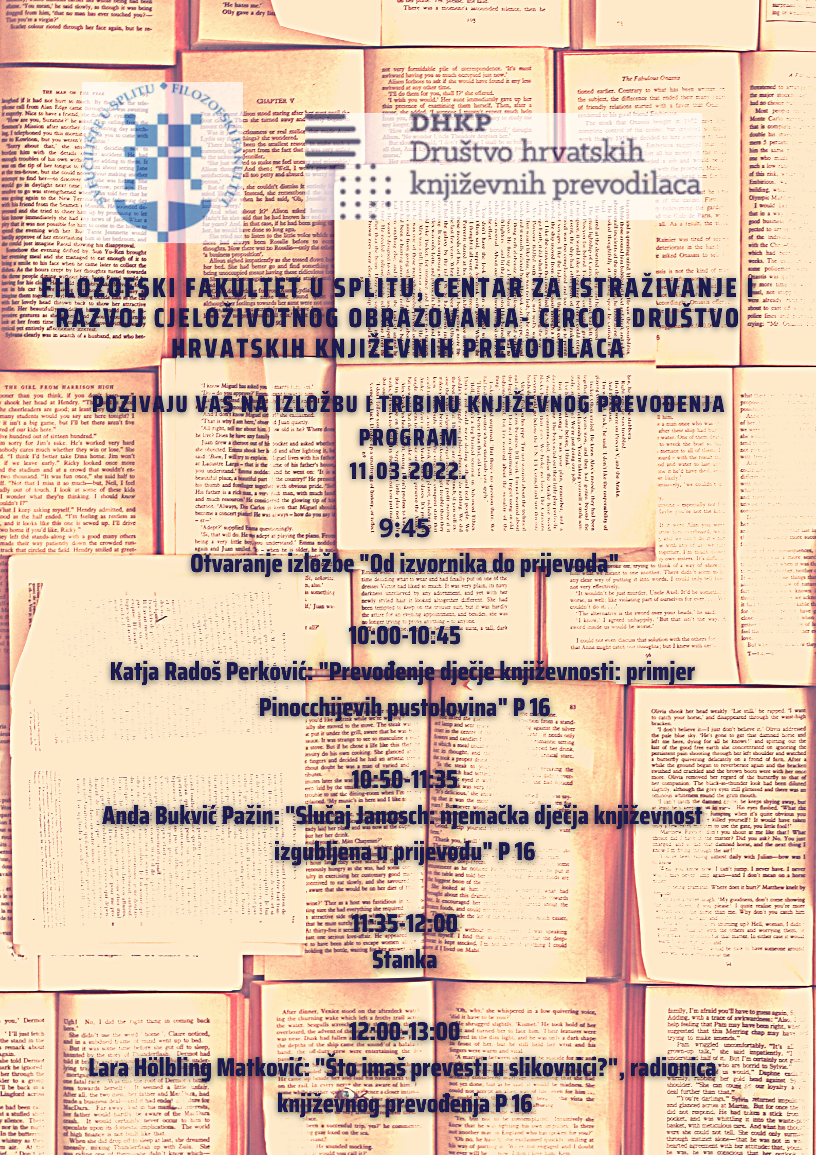 Izložba pod nazivom "Od izvornika do prijevoda," kao i tribina književnog prevođenja, održate će se 11. ožujka 2022. godine, u organizaciji Centra za istraživanje i razvoj cjeloživotnog obrazovanja (CIRCO) Filozofskog fakulteta u Splitu i Društva hrvatskih književnih prevodilaca.