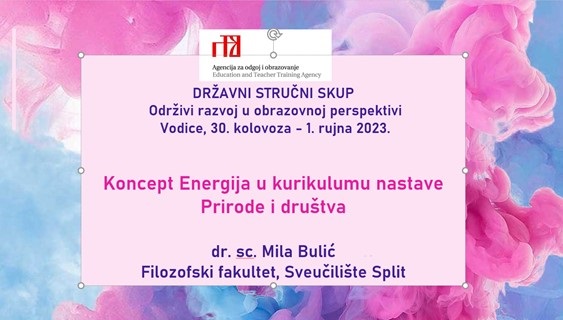 Plenarnom predavanju Koncept Energija u kurikulumu nastave Prirode i društva bio je cilj prezentirati jedinstvo koncepta energije u kurikulumu osnovnoškolskih nastavnih predmeta. Predavanjem se stavio naglasak na ono što recentna istraživanja pokazuju da učenici dobi od 7 do 9 godina znaju o energiji te su prezentirane smjernice kako učinkovito poučavati učenike razredne nastave o energiji.  Istaknuto je kako postojeće predodžbe učenika o energiji mogu biti gradivni blok daljnjeg znanja ili kamen spoticanja ako razvijaju miskoncepcije.