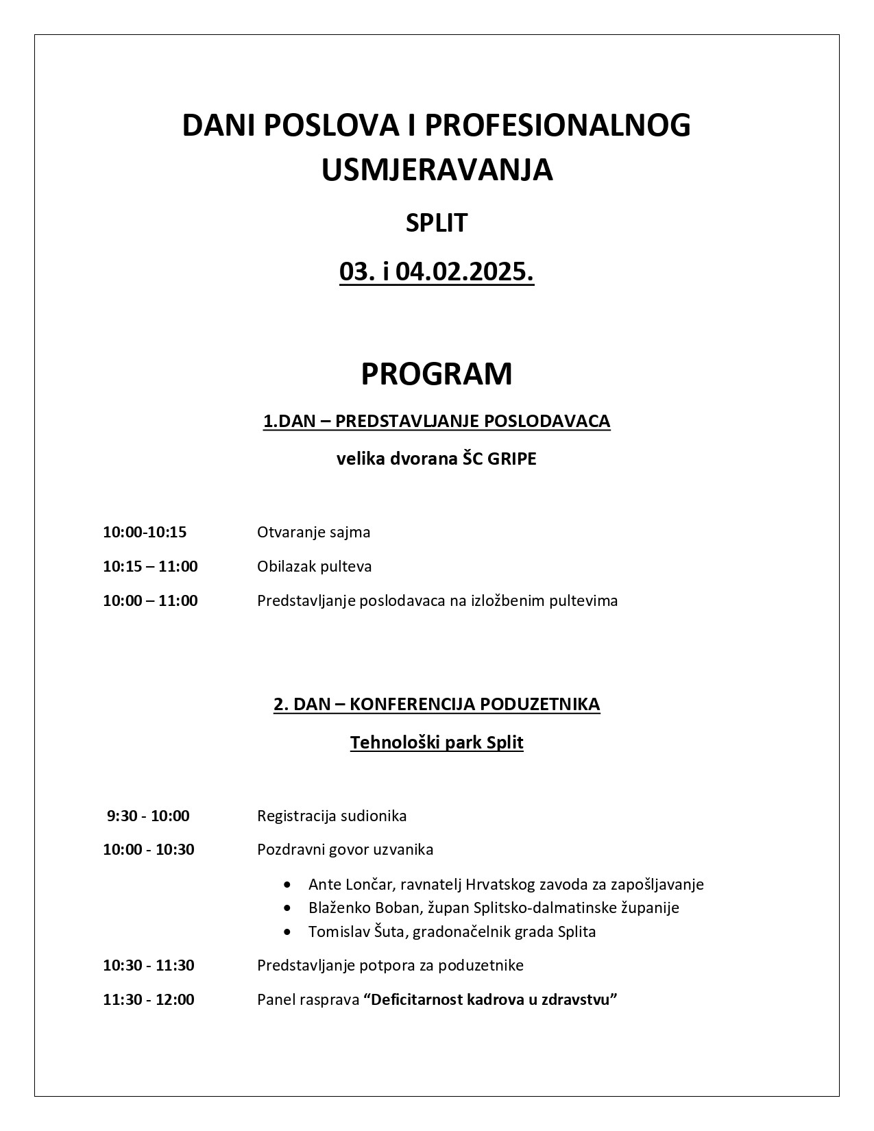 U organizaciji Hrvatskog zavoda za zapošljavanje, Splitsko-dalmatinske županije i Grada Splita i partnerstvu s Hrvatskom gospodarskom komorom - Županijskom komorom Split održat će se u Splitu Dani poslova i profesionalnog usmjeravanja, 3. i 4. veljače 2026.